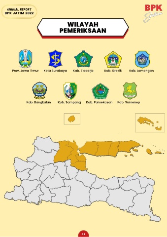 ANNUAL REPORT BPK JATIM 2022 WILAYAH WILAYAH PEMERIKSAAN PEMERIKSAAN Prov. Jawa Timur Kota Surabaya Kab. Sidoarjo Kab. Gresik Kab. Lamongan Kab. Bangkalan Kab. Sampang Kab. Pamekasan Kab. Sumenep 33